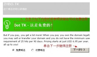 如注册“zhbo.tk”域名,仅仅填写“zhbo”即可。然后点击“下一步”继续注册。
