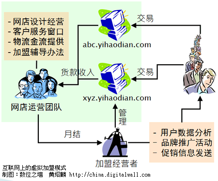 此外,从加盟店网址来看,加盟者似乎有一个自己的店面。但其实不论开设多少加盟店,最终交易都是发生在原来的直营店,加盟者根本没有自己的系统。当新浪用户来到一号店时,一号店就换上新浪招牌;当天涯用户来到一号店时,一号店就换上天涯招牌,如此而已。