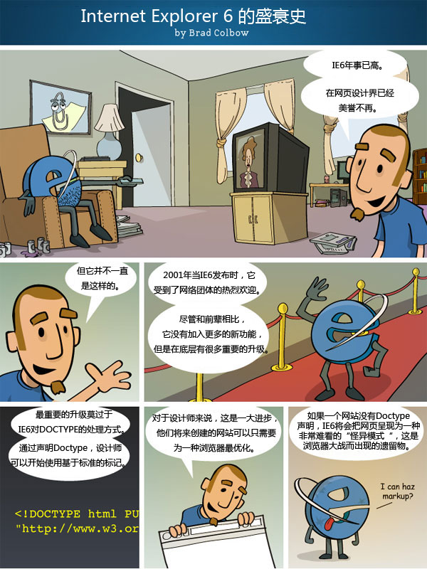 近年来,Internet Explorer 6 从网页设计师的至爱浏览器变成了烫手的山芋。安全问题,javascript的错误和令人费解的CSS怪异呈现让它成为了很多笑话首当其冲的话题。随着IE6进入它的没落时代,以及像Google这样大公司支持力度的下降,是时候充分的回顾一下我们的这个老对手了。这篇博文我们将要审视Internet Explorer 6的过去,并且分析多年来其形象改变的原因。你可以在此看到大尺寸版本的漫画。
